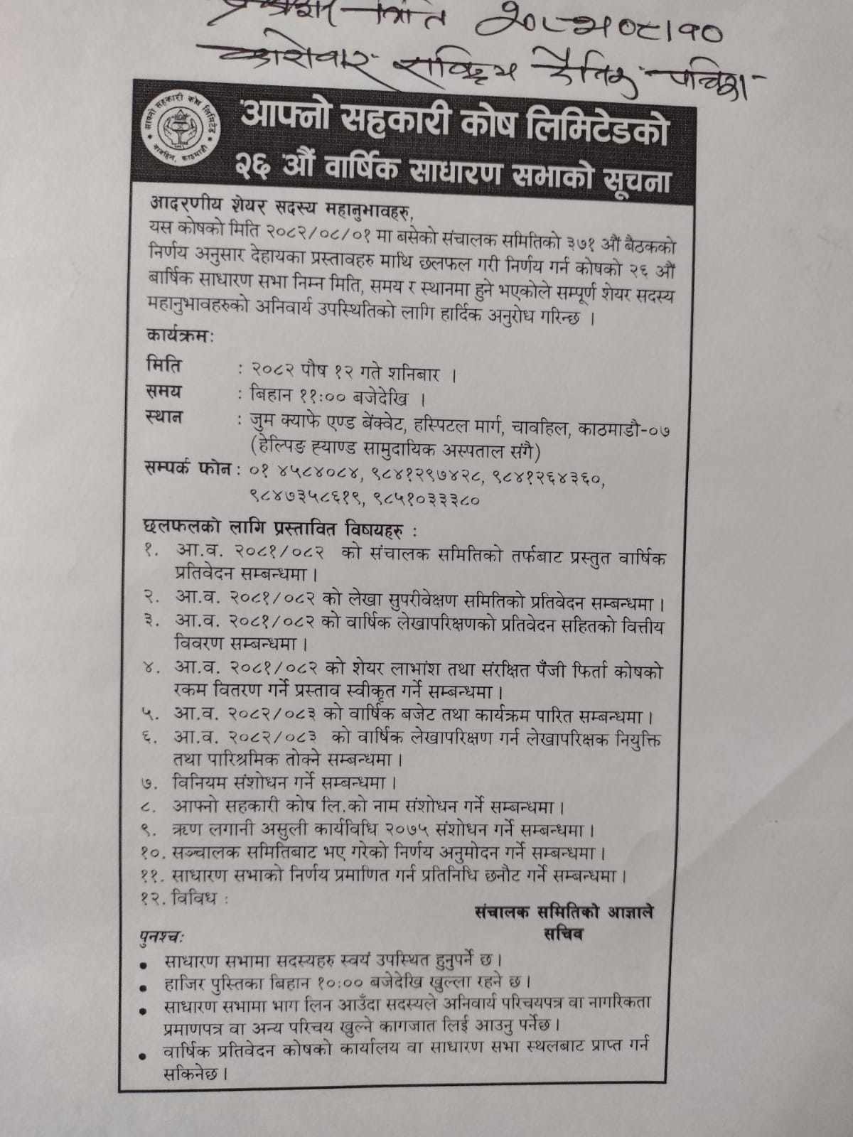 बचत तथा कर्जाको व्याज दर सम्वन्धी शेयर सदस्य महानुभावहरुलाई सूचना